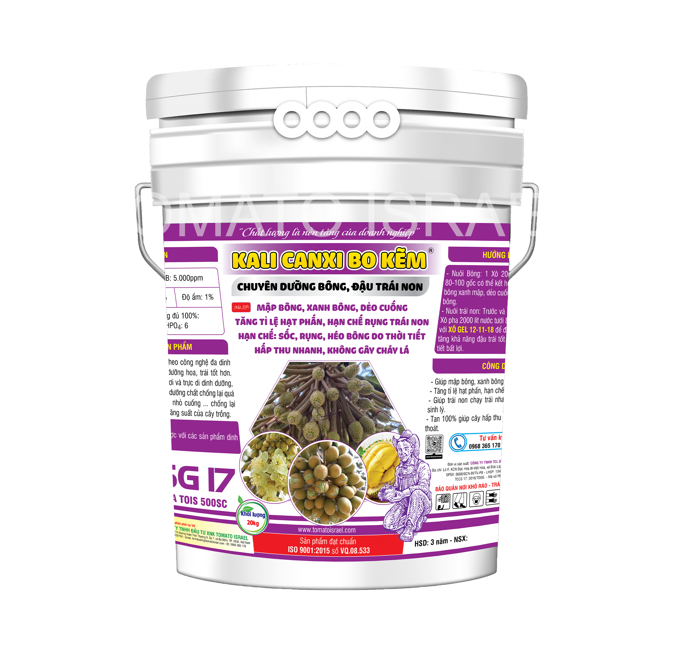 KALI CANXI BO KẼM là sản phẩm được sản xuất theo công nghệ đa dinh dưỡng giúp quá trình nuôi dưỡng hoa, trái tốt hơn, chống lại quá trình tháo khớp, buôn đỉa, nhỏ cuống,...